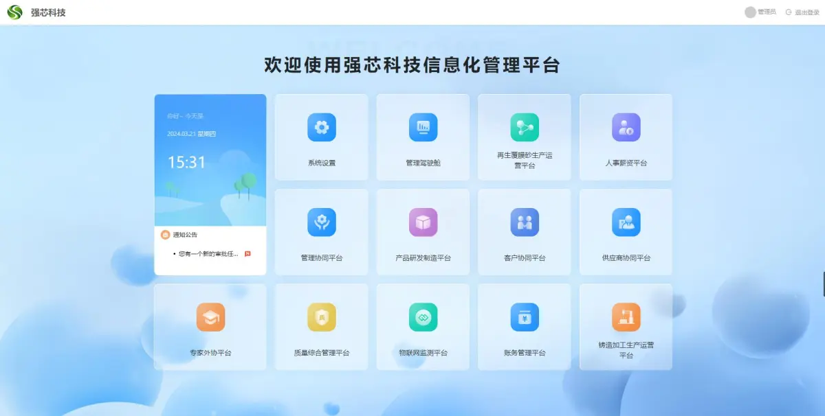 再生覆膜砂生產運營平臺:工作日志、銷售管理、倉庫管理、采購管理、車間工廠、工作流、消息中心