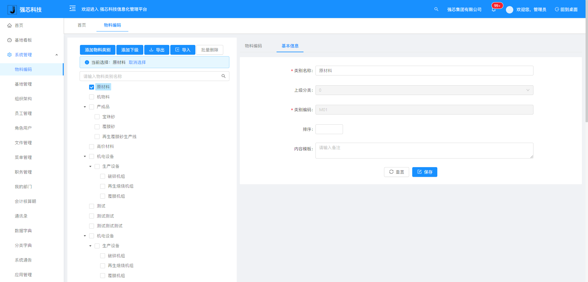 系統(tǒng)設置:物料編碼、基地管理、組織架構、員工管理、角色用戶、菜單管理、職務管理、會計核算期、授權設置