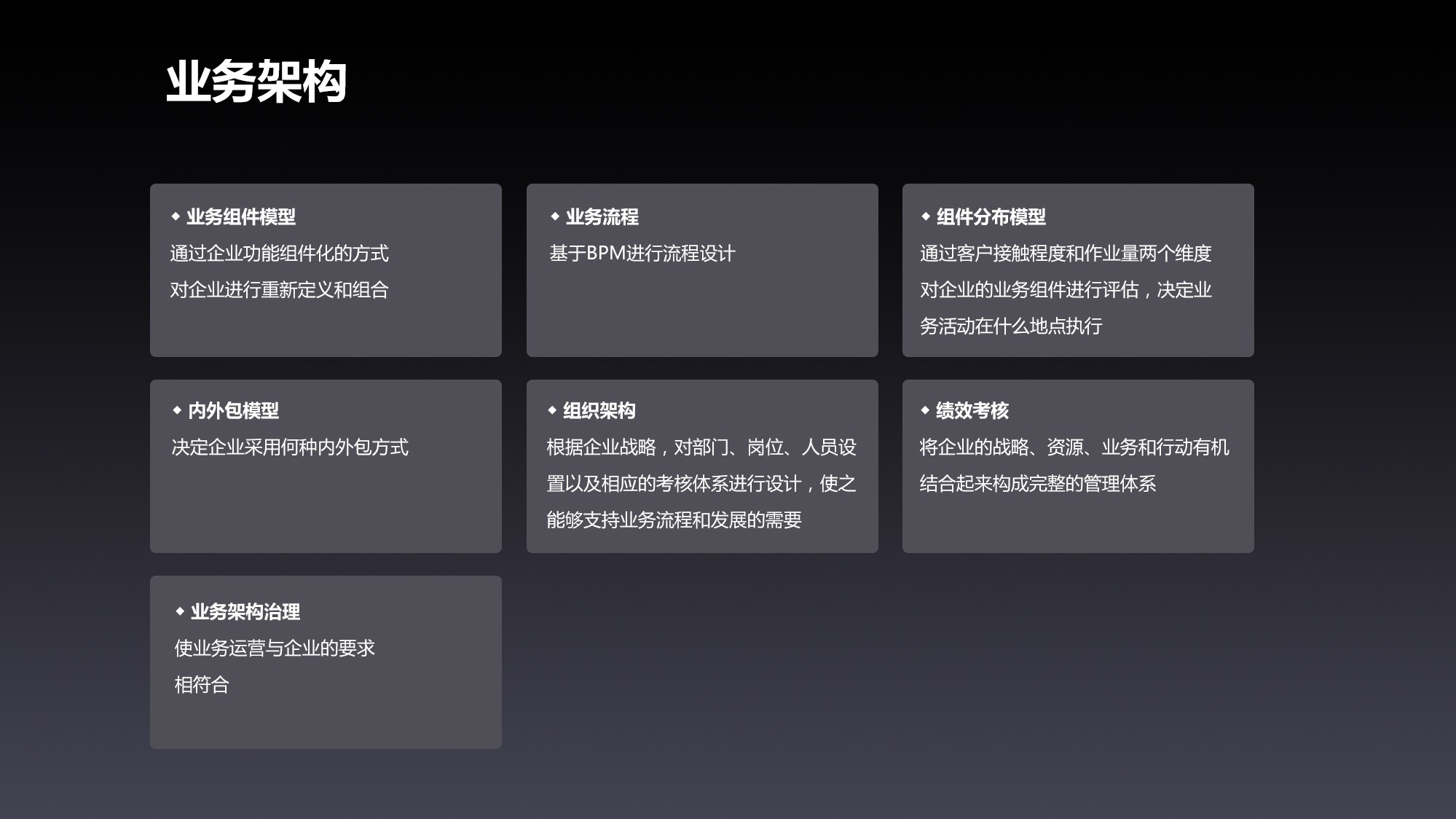 基于BPM設(shè)計業(yè)務(wù)流程,結(jié)合管理層ARC - ERP系統(tǒng)與“樞理”數(shù)據(jù)治理,梳理、優(yōu)化流程,消除冗余環(huán)節(jié),提升運(yùn)轉(zhuǎn)效率;借組件分布模型,從客戶接觸程度和作業(yè)量維度,評估業(yè)務(wù)組件,合理規(guī)劃業(yè)務(wù)活動執(zhí)行地點(diǎn),降低運(yùn)營成本;以內(nèi)外包模型,科學(xué)決策業(yè)務(wù)外包方式,聚焦核心競爭力;依據(jù)戰(zhàn)略設(shè)計組織架構(gòu),適配部門、崗位、人員及考核體系,為業(yè)務(wù)流程筑牢組織支撐;通過績效考核,串聯(lián)戰(zhàn)略、資源、業(yè)務(wù)與行動,構(gòu)建完整管理體系;依托業(yè)務(wù)架構(gòu)治理,確保業(yè)務(wù)運(yùn)營貼合企業(yè)要求,讓戰(zhàn)略落地“看得見、摸得著”。